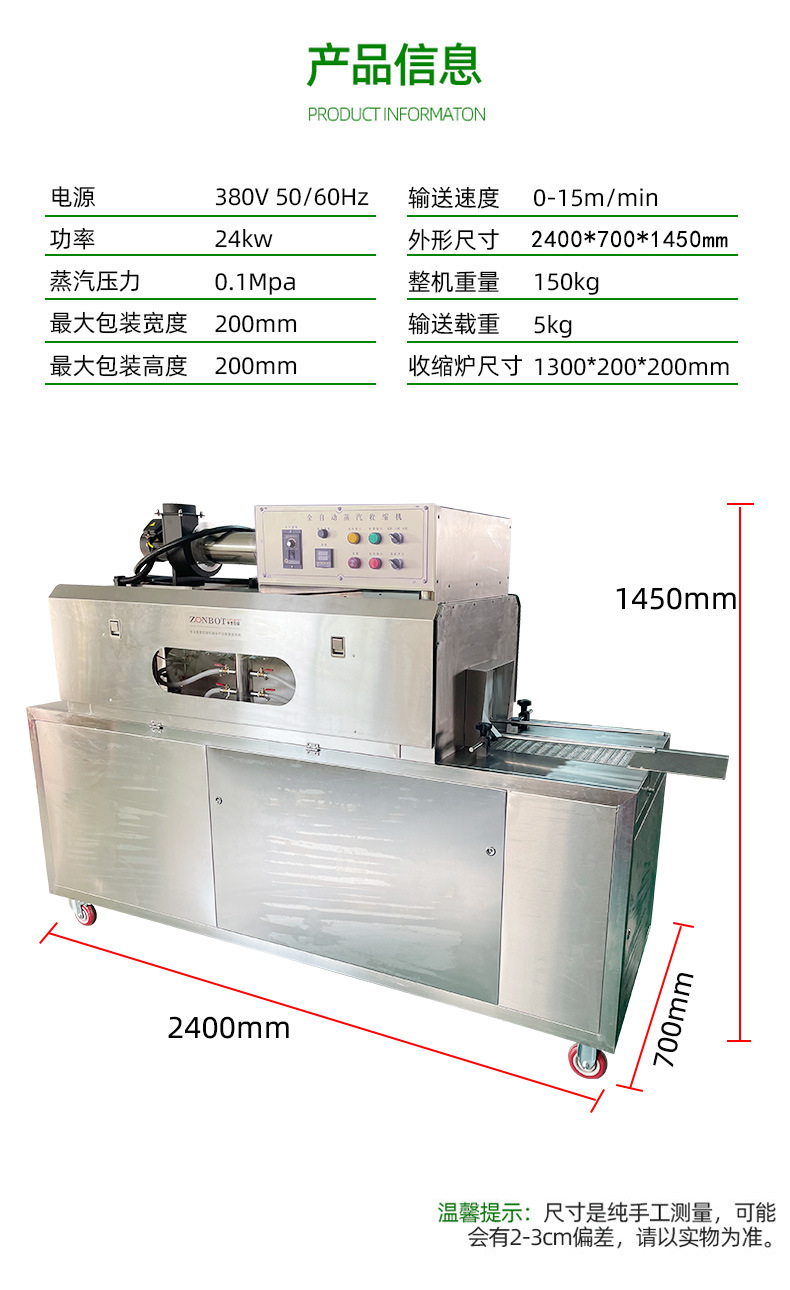 - 高效便捷:能夠快速產(chǎn)生蒸汽并進行收縮包裝,大大提高了生產(chǎn)效率。操作簡單,無需復雜的安裝和調(diào)試過程。