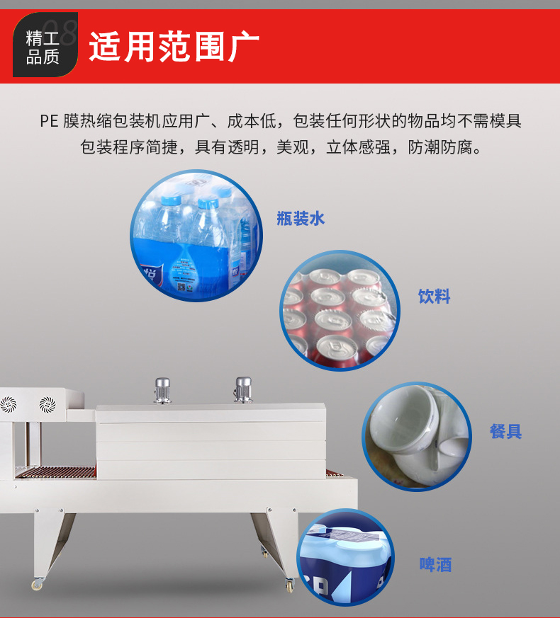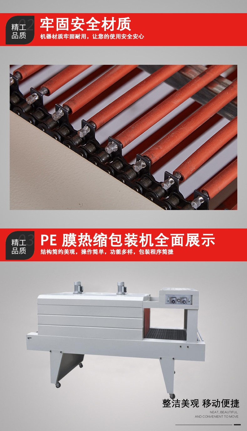 包裝質(zhì)量高:PE 熱收縮包裝機(jī)能夠使 PE 薄膜緊密地貼合產(chǎn)品,包裝后的產(chǎn)品外觀整潔、美觀,沒(méi)有褶皺。由于 PE 薄膜本身具有良好的柔韌性和透明度,包裝后的產(chǎn)品可以清晰地展示其形狀和外觀,同時(shí)也能有效地防止灰塵、水分等進(jìn)入產(chǎn)品,起到很好的保護(hù)作用。