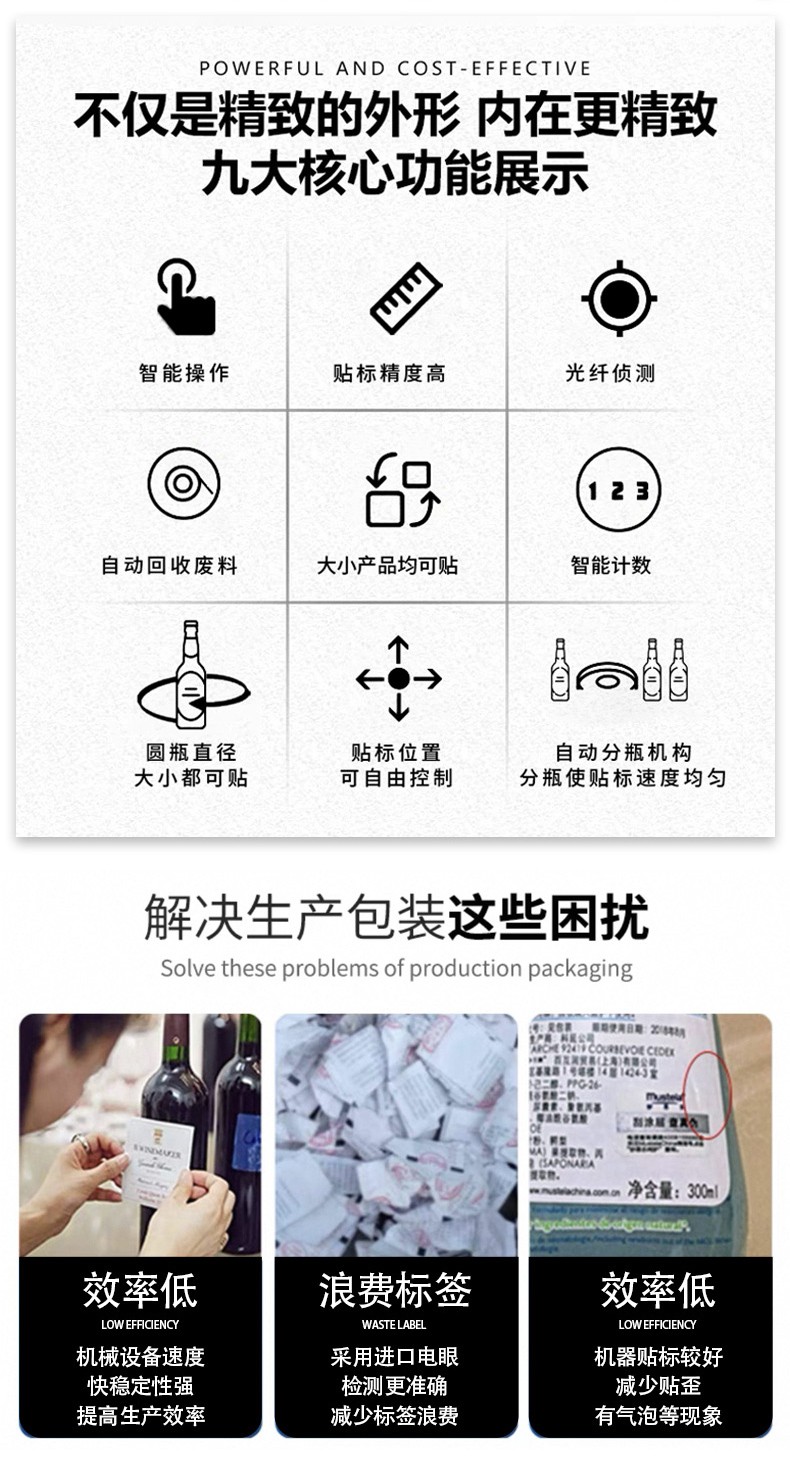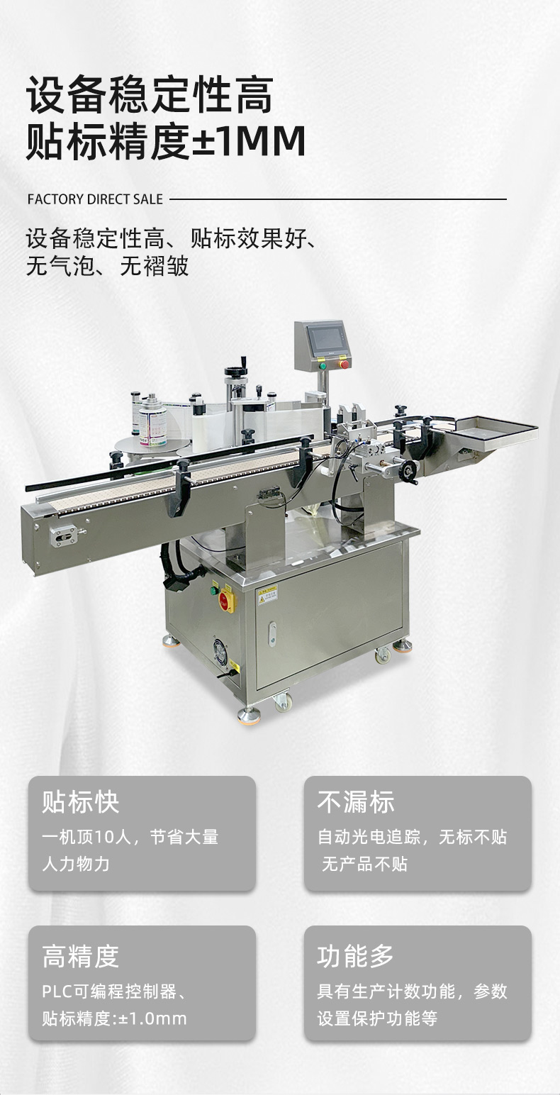 • 貼標:當圓瓶到達貼標位置時,貼標機構(gòu)的標簽牽引裝置根據(jù)預(yù)設(shè)的標簽長度,將標簽從標簽卷上牽引出來,貼標頭在控制系統(tǒng)的指令下,將標簽準確地貼附在圓瓶表面。同時,壓標裝置對標簽進行壓實,使其牢固地粘貼在瓶身上。