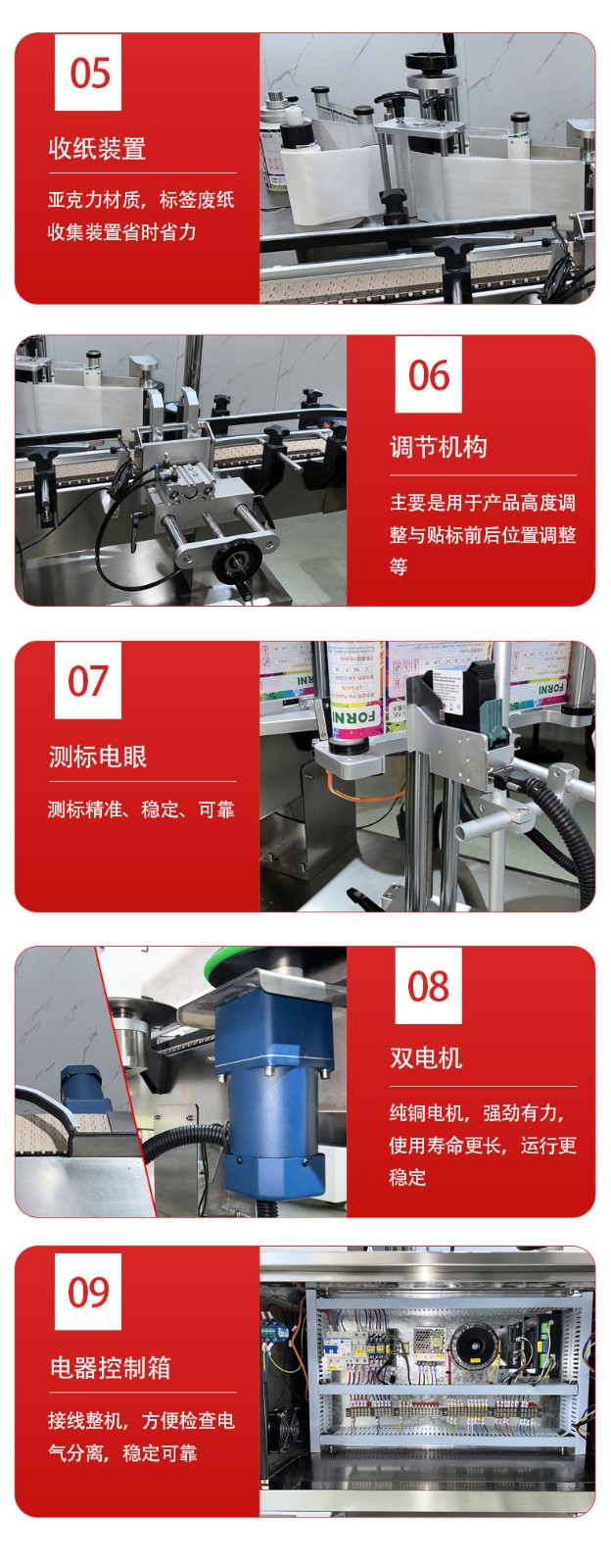 • 貼標機構(gòu):主要包括標簽放卷裝置、標簽牽引裝置、貼標頭和壓標裝置等。標簽放卷裝置用于放置標簽卷,能自動放卷并保持標簽的張力穩(wěn)定。標簽牽引裝置通過電機驅(qū)動,精確控制標簽的輸送長度和速度,使其與圓瓶的輸送速度相匹配。貼標頭采用高精度的機械結(jié)構(gòu)和氣動元件,能準確地將標簽貼附在圓瓶表面,并且可以根據(jù)圓瓶的直徑和貼標位置進行調(diào)整。壓標裝置在標簽貼附后,對標簽進行壓實,確保標簽與瓶身緊密貼合,無氣泡或皺褶。