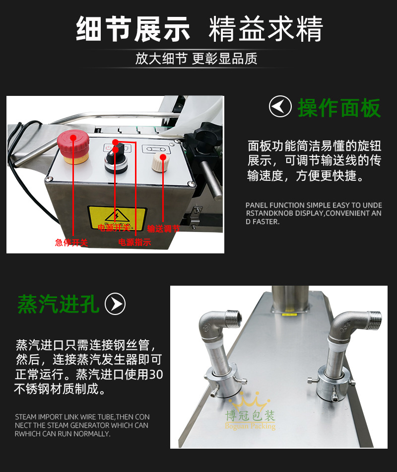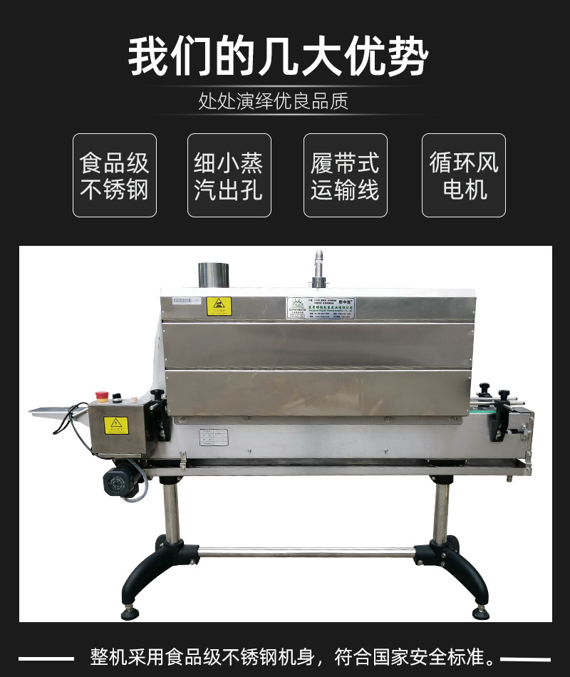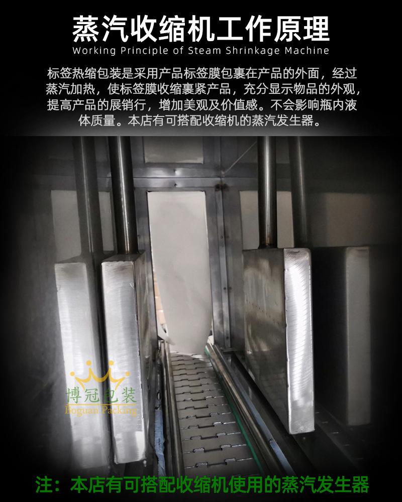 蒸汽式熱收縮機可以根據(jù)不同的生產(chǎn)速度來調(diào)節(jié)設(shè)備功率的大小,輸送帶采用無級調(diào)速,輸送速度可以任意調(diào)節(jié)。廣泛應(yīng)用于大桶或小瓶裝礦泉水、純凈水;汽水和茶飲料等食品飲料行業(yè),以及化妝品、洗發(fā)水和五金電子等需要收縮膜包裝的場合使用