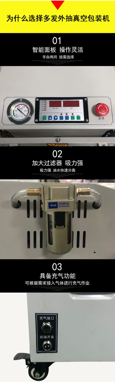 真空包裝機包括食品真空包裝機都是由真空系統(tǒng)、抽充氣密封系統(tǒng)、熱壓封合系統(tǒng)、電器控制系統(tǒng)等組成。外抽式真空包裝機是將包裝袋內(nèi)抽成低真空后,當即自動封口,由于袋內(nèi)真空度高,殘留空氣極少,抑制細菌等微生物的繁殖,避免了物品氧化、霉變和腐敗,同時對某些松軟的物品,經(jīng)全自動真空包裝機包裝后,可縮小包裝體積,便于運輸和貯存。