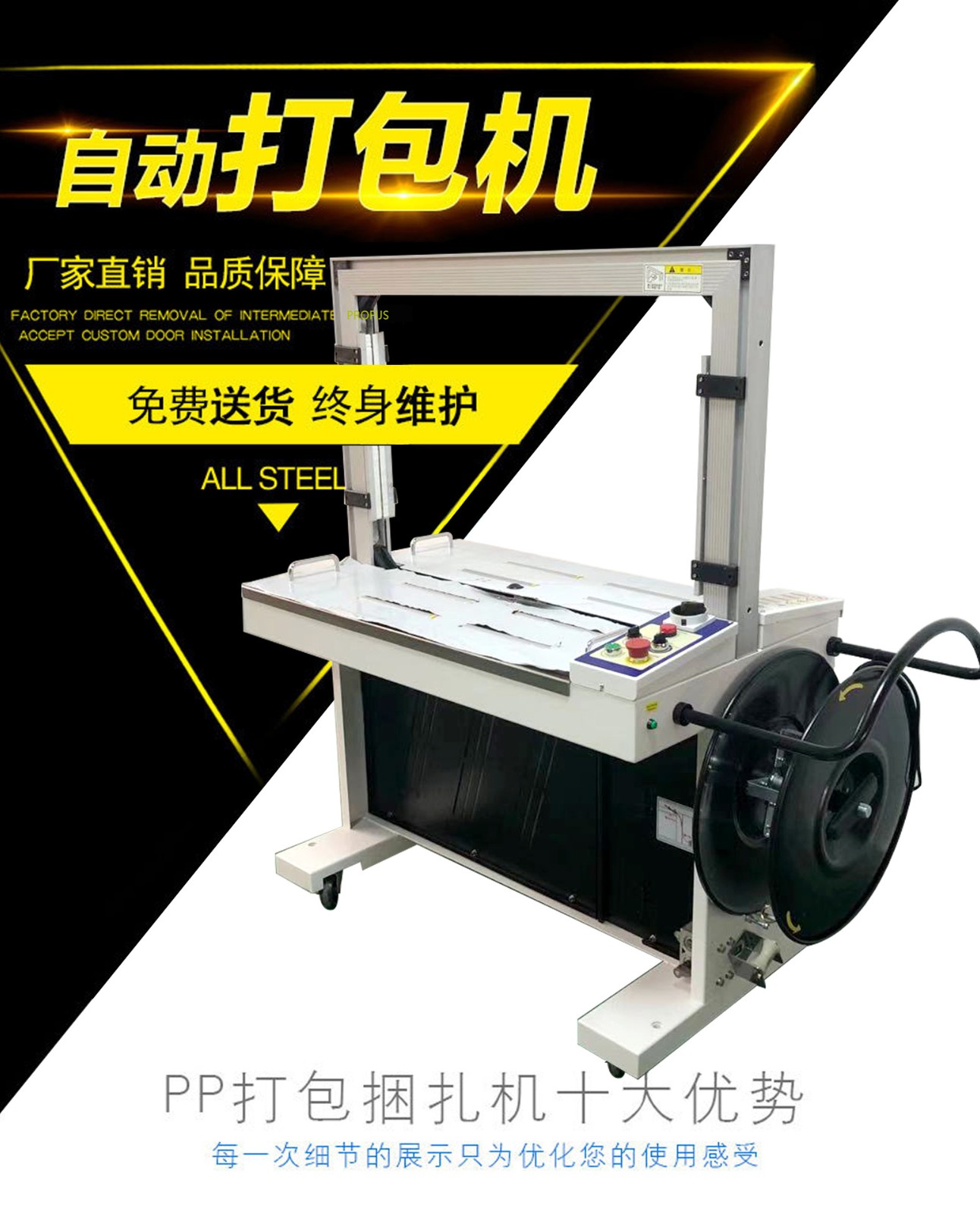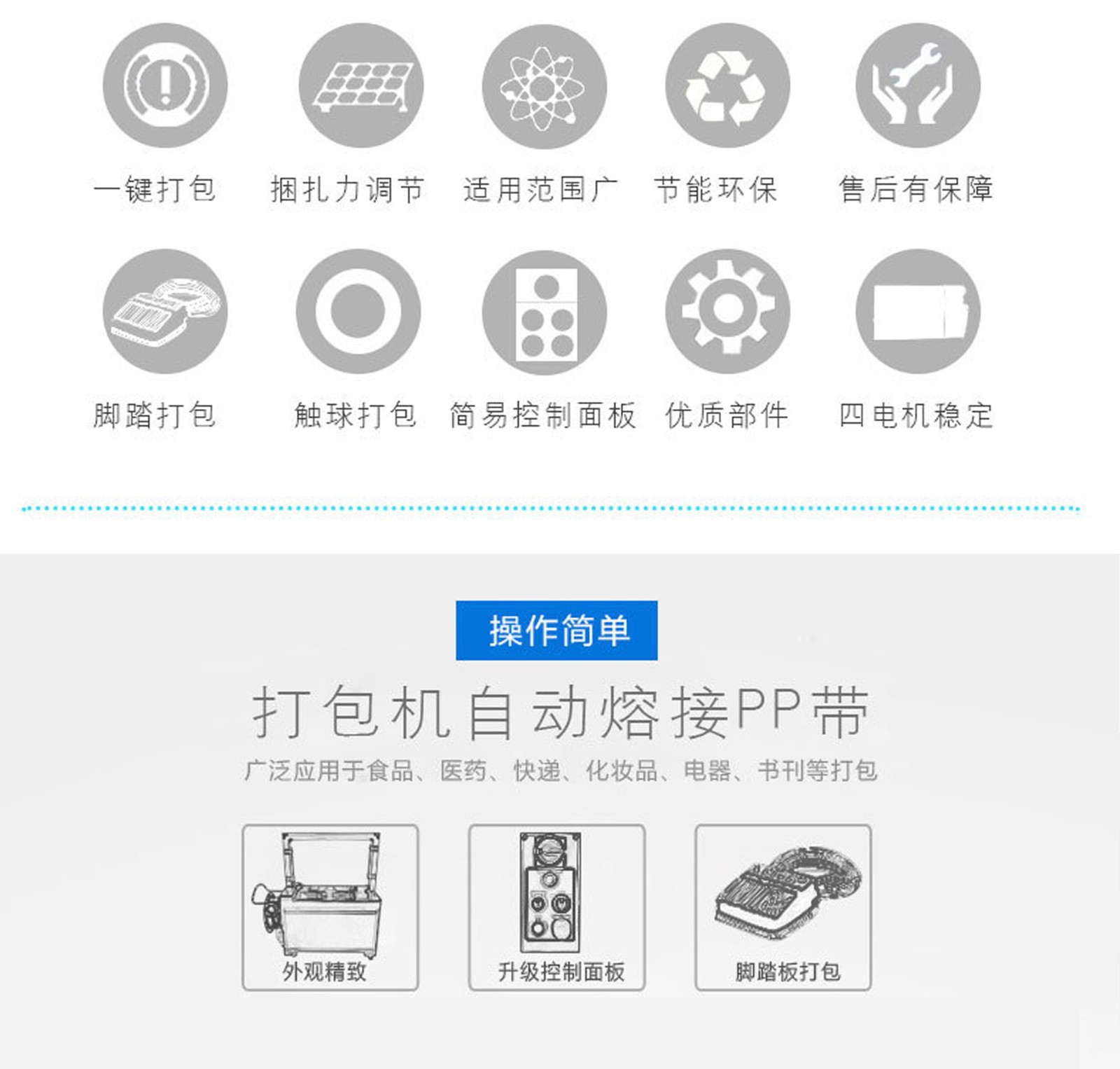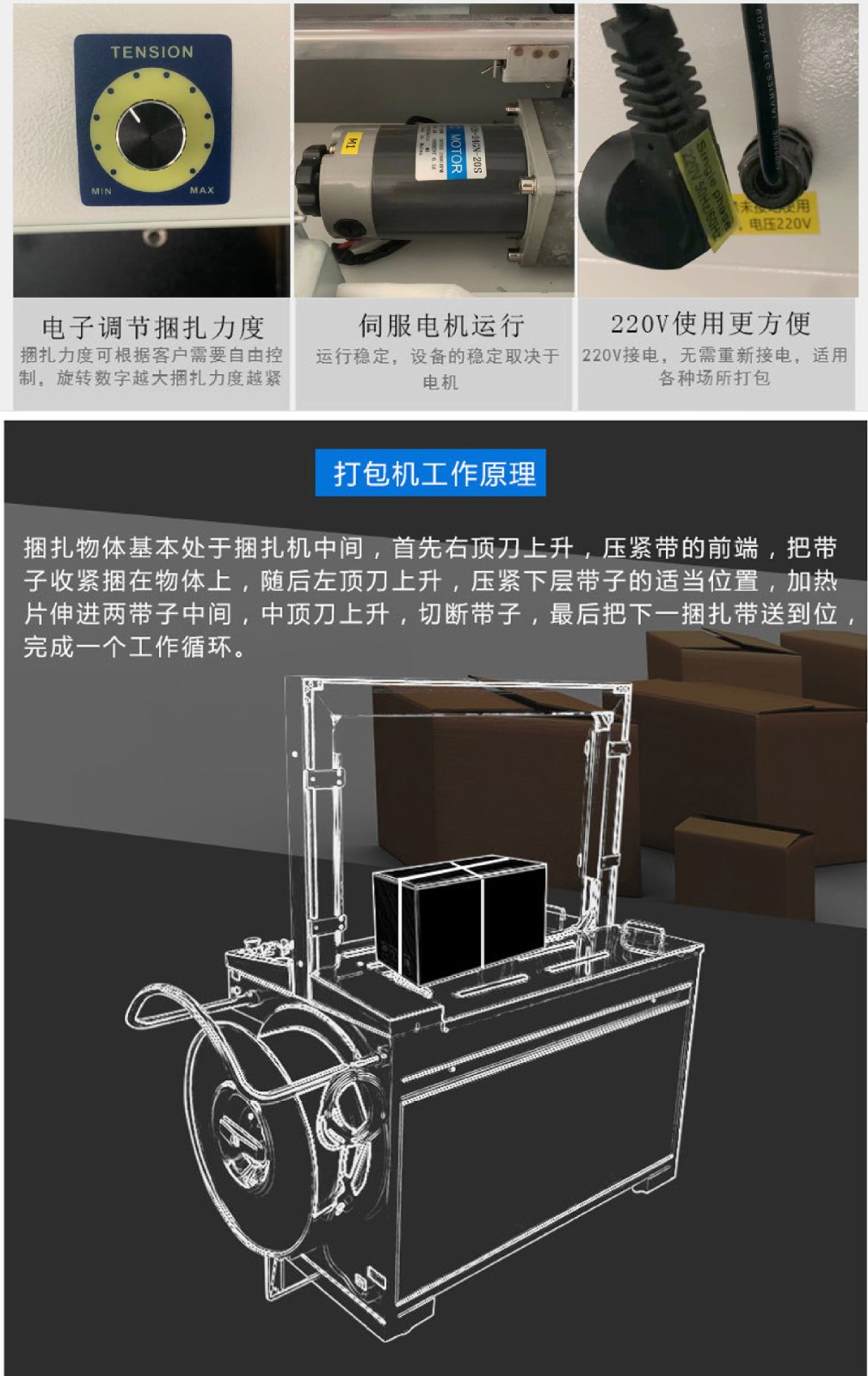 打包機(jī)又稱(chēng)捆包機(jī)、打帶機(jī)或捆扎機(jī),是使用捆扎帶捆扎產(chǎn)品或包裝件,然后收緊并將兩端通過(guò)發(fā)熱燙頭熱融粘接方式結(jié)合。打包機(jī)的功能是加固包裝物品的,使物品在搬運(yùn)過(guò)程中、貯存中不因捆扎不牢而散落,同時(shí)還應(yīng)捆扎整齊美觀。