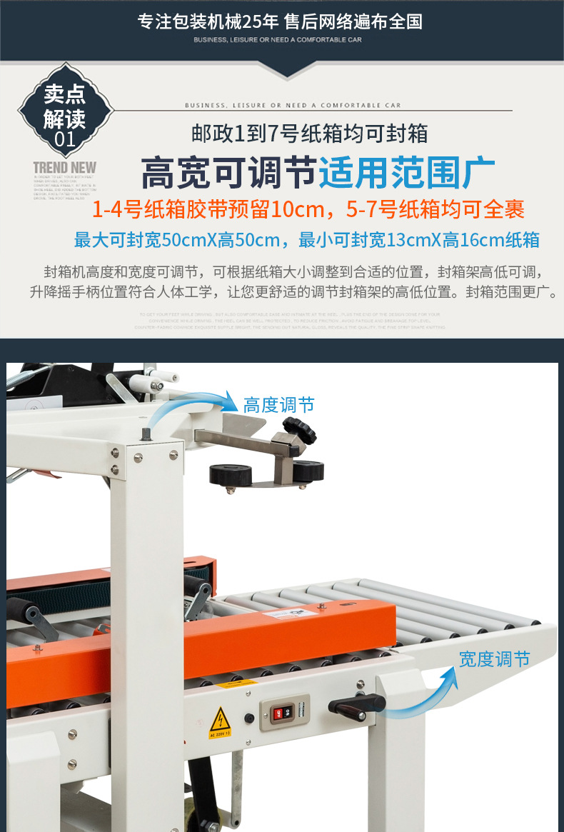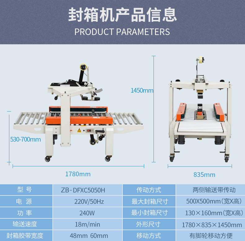 全自動封箱機廣泛用于食品、日化、醫(yī)療制藥、化妝品、服裝、電商、物流、電子、五金、化工、郵政等行業(yè),適用于紙箱打包、紙張打包、包裹打包、日化用品打包、陶瓷制品打包